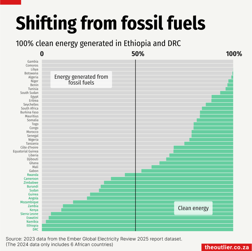 Ember’s Global Electricity Review 2025 report states that 80 countries generated more than 50% of their electricity from clean sources in 2024. Although Ember only has 2024 data for six African countries, their 2023 data shows that 15 African countries generated more than half their electricity from clean sources.