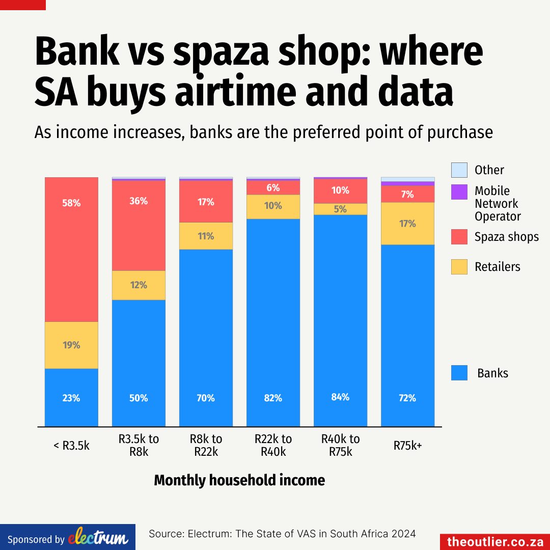 This recent research into consumer behaviour by Electrum suggests that accessibility is a strong driver. Spaza shops have the highest daily transactions for airtime and data and they are more accessible in low-income areas than larger retailers.