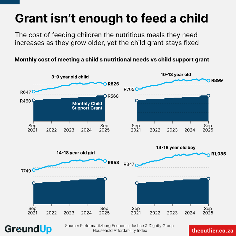 The cost of meeting a child’s nutritional needs varies between R826 and R1,085 a month, depending on the age, according to the Pietermaritzburg Economic Justice and Dignity Group (PEJDG). [GroundUp story]