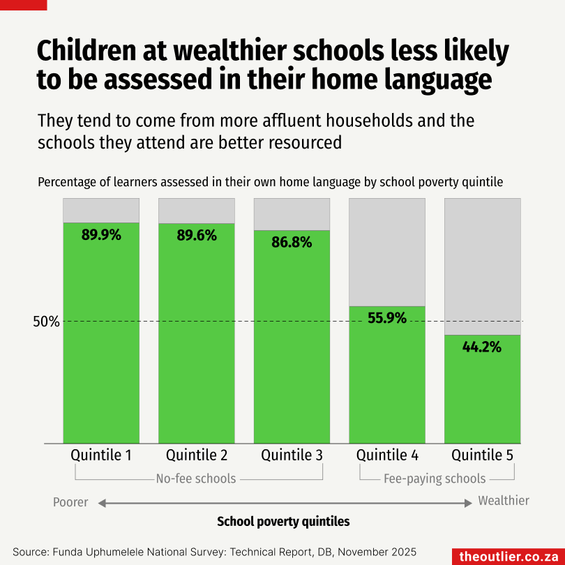 But socio-economic factors play a part. Children at schools in better off areas (the quintile 4 and 5 schools) did better in the reading assessments, even though they were less likely to be taught in their home language in those schools.