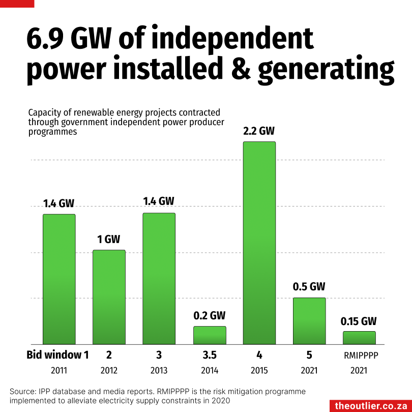 Since 2011, the government has run seven REIPPPP bid windows and contracted more than 11 GW of renewable capacity. So far, 60% of that (or 6.785 GW) has been built and is adding electricity to the grid. That includes all the projects in the first four bid windows and five of the bid window 5 projects.