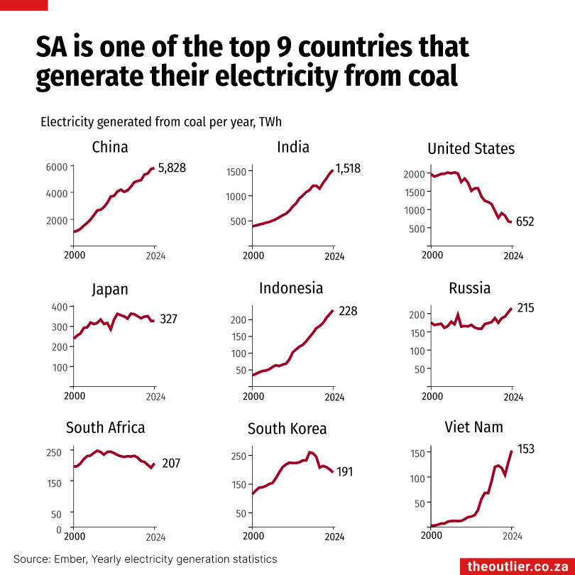 South Africa is one of the top countries in the world for the amount of electricity it generates from coal. It ranked seventh in 2024, generating just over 200TWh of coal-powered energy. 2024 is the latest year of data available from Ember, an energy think tank.