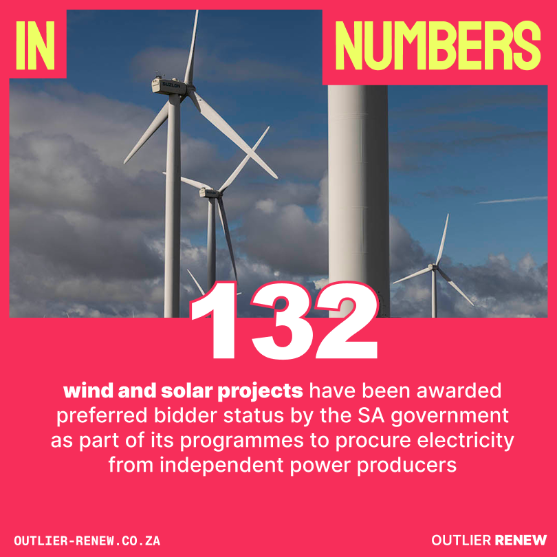 132 wind and solar projects have been awarded preferred bidder status by the SA government as part of its programmes to procure electricity from independent power producers. 101 (76.5%) of those projects are reported to be operational at the end of 2025.