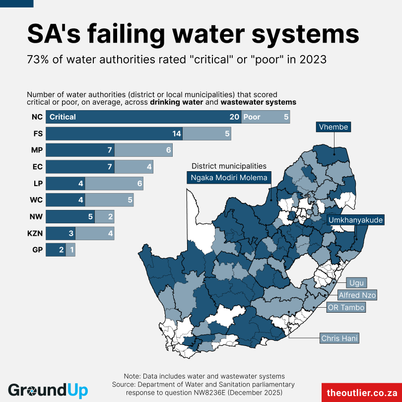 The water systems in 104 of these municipalities were rated “poor” or “critical” by the Department of Water and Sanitation’s most recent Green and Blue Drop assessments in 2023. The assessments consider the condition, capacity, and maintenance of water infrastructure.