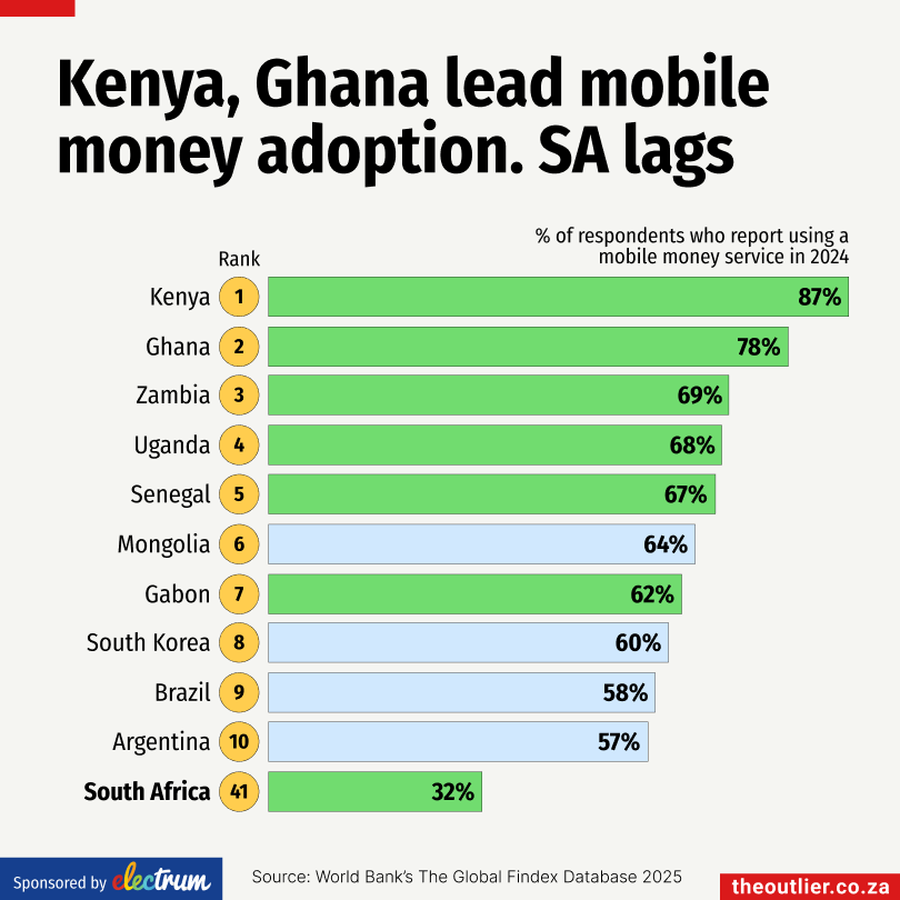 By contrast, South Africa ranked 41st globally, with just 32% of adults reporting mobile money use. It underscores how uptake varies sharply across African markets despite the continent’s overall leadership in the sector.