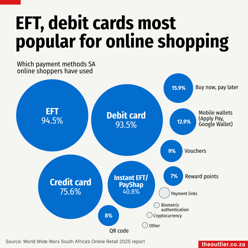 A 2025 survey of 201 heads of technology at South African retailers, including owners, managing directors and CEOs, found that EFTs dominate online payments, used 94.5% of the time by customers. Debit cards follow closely at 93.5%, while credit cards lag a little bit at 75.6%.