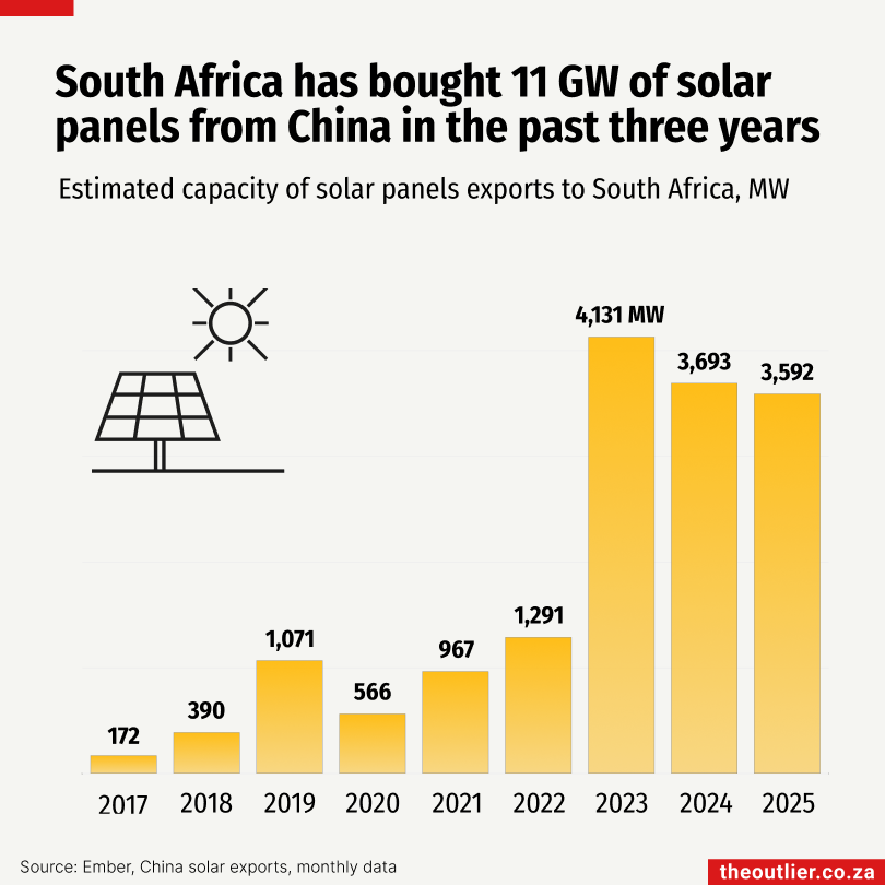 Chinese solar panel exports to South Africa shot up in 2023. And even though national loadshedding effectively ended early in 2024, the demand for solar panels has remained high. In 2025 alone, more than 6-million solar panels were imported into South Africa from China, according to energy think-tank Ember’s data.