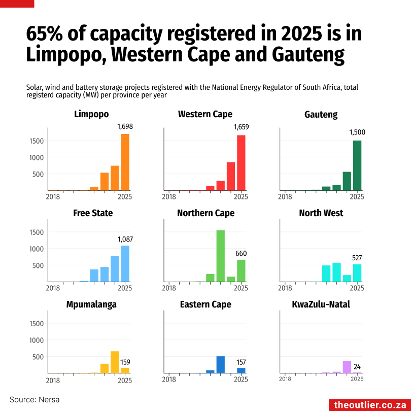 Mpumalanga, the Eastern Cape and KwaZulu-Natal barely featured in 2025. More capacity was registered in the North West and the Northern Cape than in 2024.