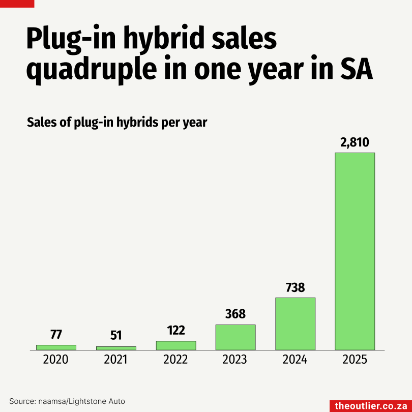 Sales of plug-in hybrids (PHEVs) nearly quadrupled in South Africa in 2025. The number of vehicles sold jumped from 738 units in 2024 to 2,810.