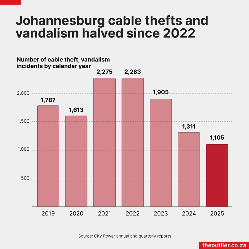Joburg recorded 1,105 incidents of cable theft and vandalism in 2025, roughly three a day. While it’s a major improvement from the 2,283 incidents in 2022, or six a day, it is still a problem for residents and businesses that lose power because of vandalised and stolen cables.