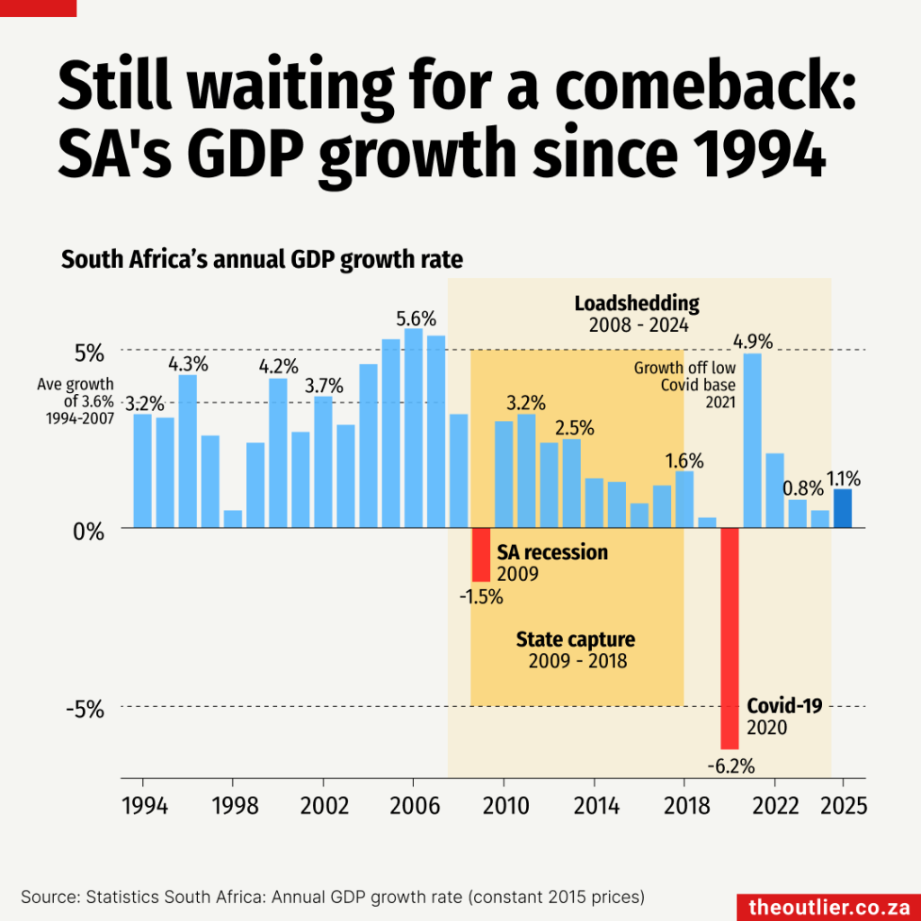 Between 1994 and 2007, South Africa averaged 3.6% growth thanks to a commodities boom, an expanding middle-class and a surplus budget in 2007/08. But loadshedding, the 2008 global recession and state capture dragged the 2008–2019 average down to 1.6%. Post-Covid recovery has yet to restore those early highs.