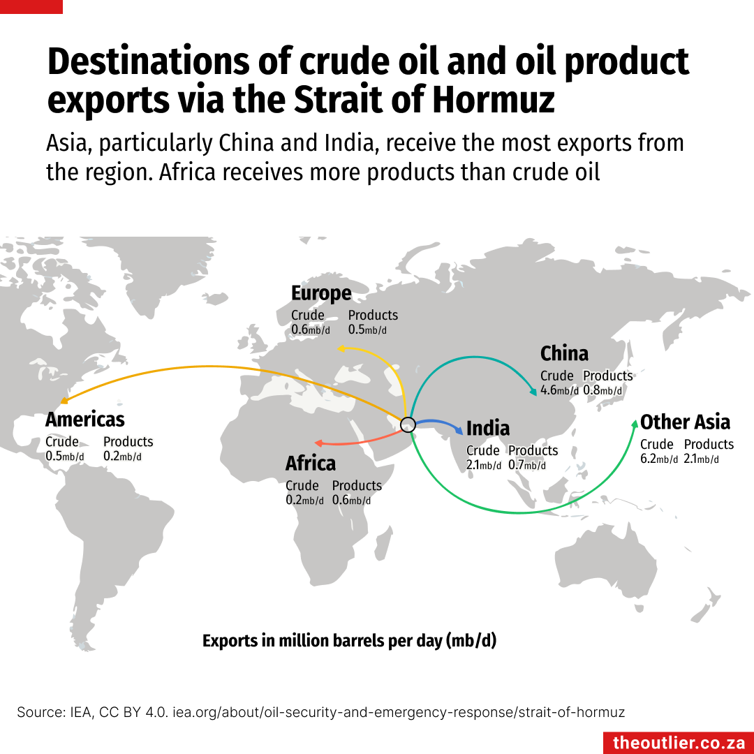 About 25% of the world’s seaborne oil is shipped through the Strait of Hormuz, according to the International Energy Agency. In 2025 that was an average of 20-million barrels a day of crude oil and oil products. The Strait of Hormuz is the primary export route for oil from Saudi Arabia, the United Arab Emirates (UAE), Kuwait, Qatar, Iraq, Bahrain and Iran.