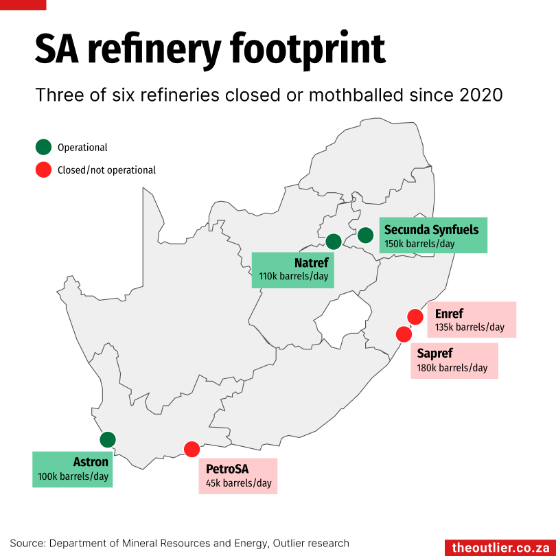 Even though South Africa imports most of its crude oil from West Africa, it has lost a chunk of its refining capacity. Three of its six refineries have closed since 2020, halving the country’s capacity from 720,000 barrels per day to 360,000. This leaves the country heavily dependent on imported diesel and petrol. South Africa reportedly imports about two-thirds of these refined fuels.