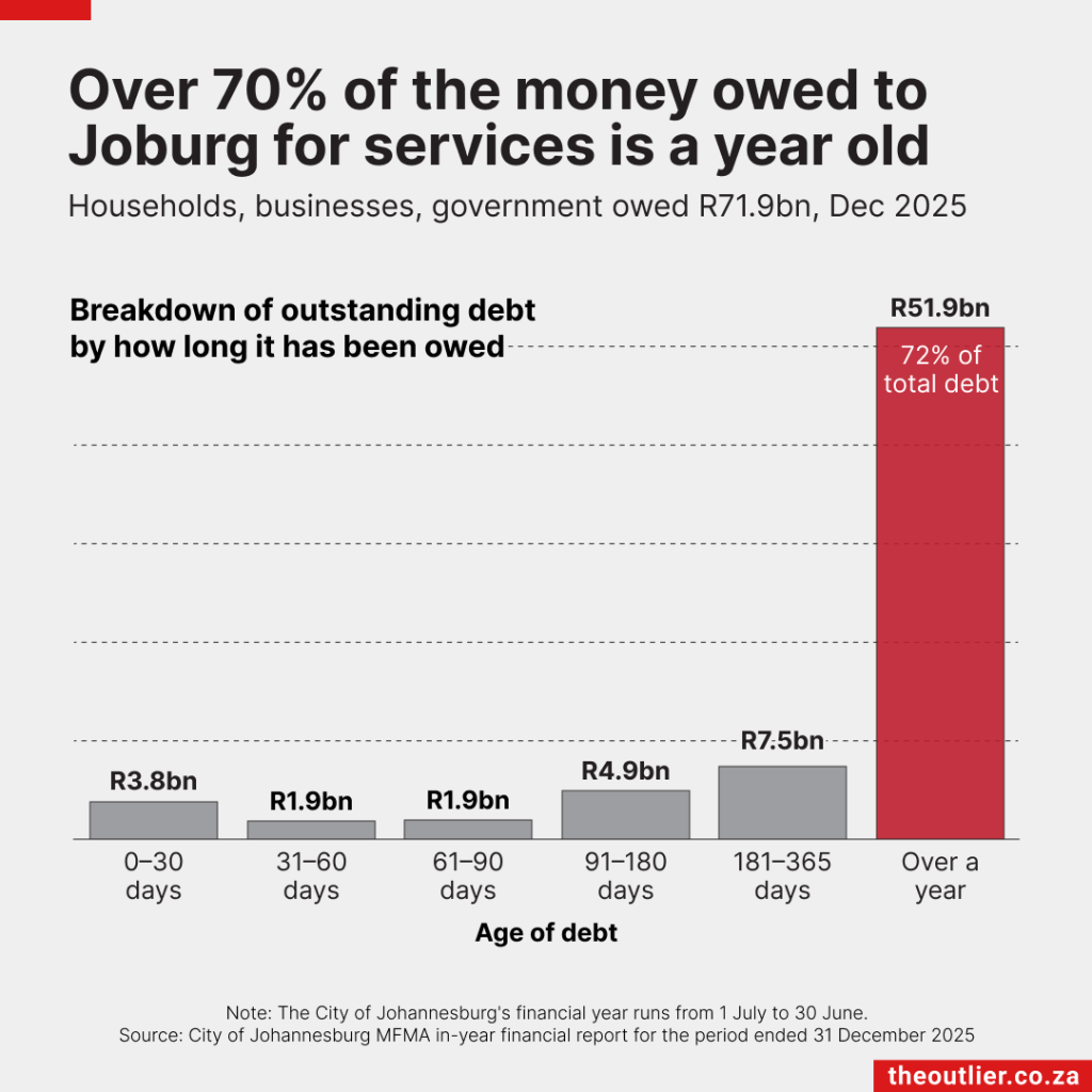 The City of Johannesburg is facing a severe revenue crisis. By December 2025, residents, businesses and government entities owed R71.9-billion, with over 70% more than a year old and at serious risk of never being recovered.