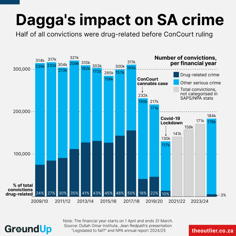 There is a gap in the data between 2021 and 2023 because the NPA’s annual reports for those years did not contain figures for total drug-related convictions. In the NPA’s 2024/25 annual report, only 5,575 drug-related convictions are reported.