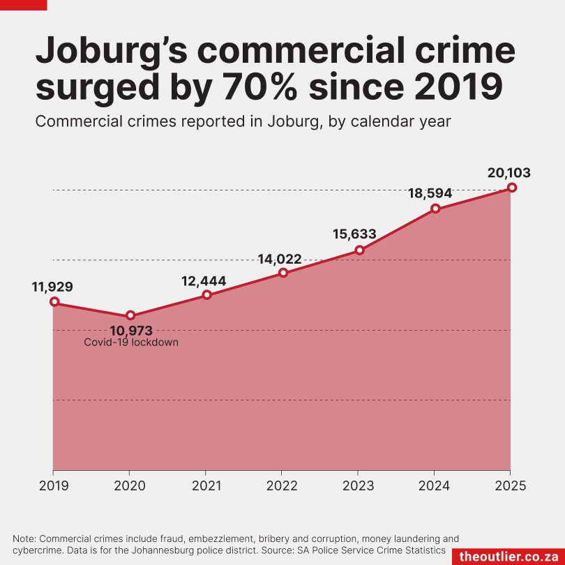 Commercial crime in the Johannesburg police district has increased by 70% over six years. Between January and December 2019, there were 11,929 reported cases of commercial crime, which includes fraud, embezzlement and cybercrime. By 2025, the number had risen to 20,103, according to South African Police Service data. This mirrors the national trend, where cases rose from 85,784 to 145,807 over the same period.