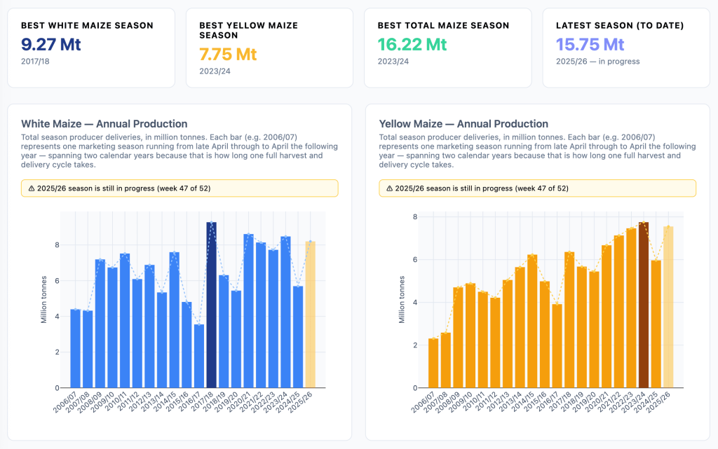 This week we spent a few days in Paarl in SA’s agricultural heartland. As part of a presentation on building data resources we produced a dashboard about some of SA’s critical grain crops including maize and wheat. Looks like it’s been a good year for mealies.
